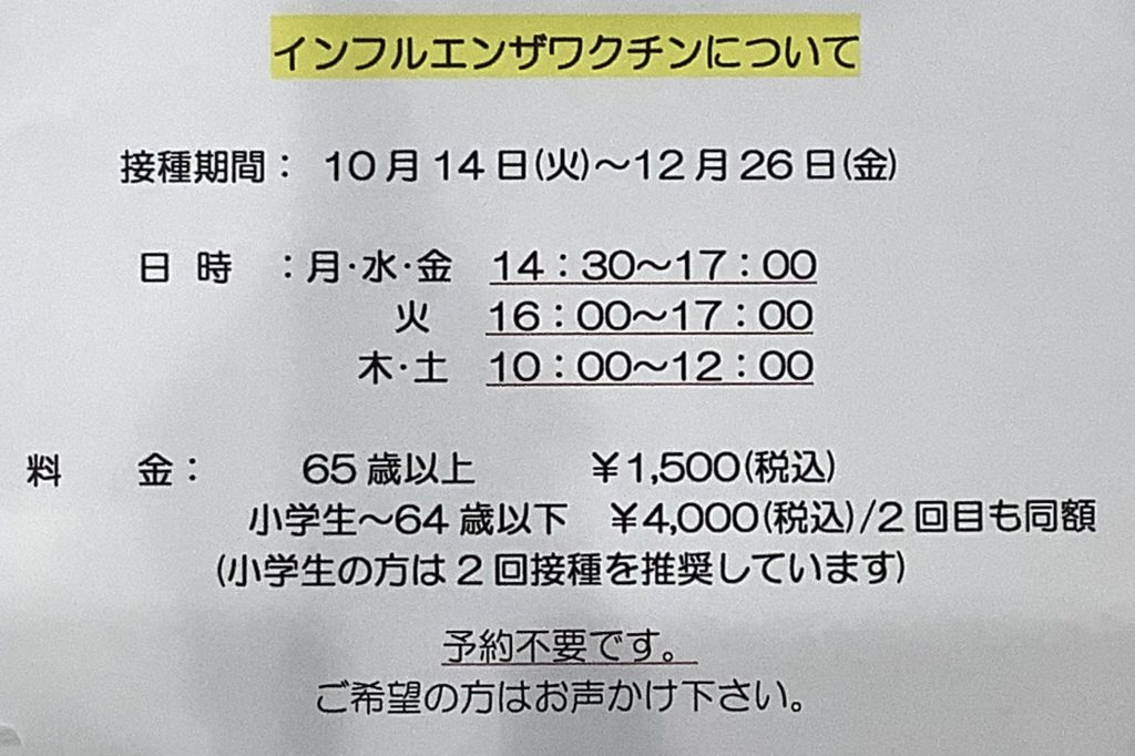 10月14日からインフルエンザワクチンの接種を開始します。 予約不要ですので、受付に直接お声掛け下さい。 月・水・金曜 14:30〜17:00 火 16:00〜17:00 木・土 10:00〜12:00の間に受付をお願いします。 65歳以上の方 ¥1,500 小学生〜64歳の方 ¥4,000(2回目も同額)